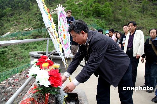 5月9日下午,中國(guó)美協(xié)黨組書記、常務(wù)副主席吳長(zhǎng)江等美協(xié)領(lǐng)導(dǎo)帶隊(duì)來(lái)到北川縣地震遺址悼念在去年大地震中逝去的同胞。由中國(guó)美術(shù)家協(xié)會(huì)、四川省委宣傳部等主辦的“感恩·重建——“5·12”汶川大地震一周年全國(guó)美術(shù)作品展”當(dāng)日在四川美術(shù)館開(kāi)幕。中新社發(fā) 王保勝 攝