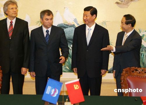 6月2日下午,中聯(lián)部部長王家瑞(右一)在北京人民大會(huì)堂與俄羅斯“統(tǒng)俄黨”總委會(huì)主席團(tuán)書記、俄羅斯國家杜馬副主席維·沃洛金(左二)簽署《中國共產(chǎn)黨與統(tǒng)一俄羅斯黨合作協(xié)議》、《中國共產(chǎn)黨與統(tǒng)一俄羅斯黨2009-2011年合作備忘錄》兩項(xiàng)協(xié)議。中共中央政治局常委、國家副主席習(xí)近平(右二)出席簽字儀式。中新社發(fā) 任晨鳴 攝