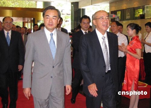 中國國民黨主席吳伯雄率參加第五屆兩岸經(jīng)貿(mào)文化論壇的中國國民黨代表團(tuán),7月10日下午乘臺北直飛的包機(jī)抵達(dá)湖南長沙黃花機(jī)場。中共中央臺辦主任王毅等到機(jī)場歡迎。第五屆兩岸經(jīng)貿(mào)文化論壇將于7月11日至12日在長沙舉行,論壇的主題是兩岸文教交流。中國國民黨、親民黨、新黨、無黨團(tuán)結(jié)聯(lián)盟、部分民進(jìn)黨人士,和眾多臺灣文化、教育、宗教屆和經(jīng)濟(jì)界代表與會。中新社發(fā) 傅煜 攝