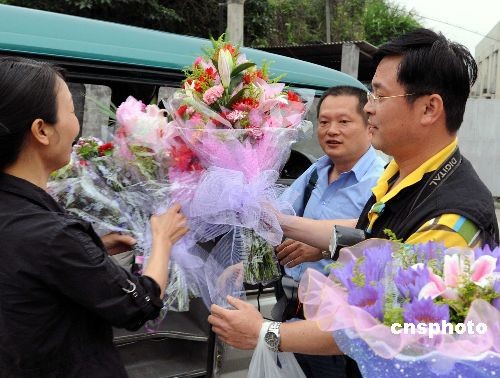 5月27日傍晚,在福州定點(diǎn)場(chǎng)所解除醫(yī)學(xué)觀察后,兩名福建省首例輸入性甲型H1N1流感確診患兒同機(jī)接觸者接受親友(左一)贈(zèng)送的鮮花。當(dāng)日,福建省衛(wèi)生廳在其網(wǎng)站上發(fā)布福建省甲型H1N1流感防控信息通報(bào),截止5月26日24:00,衛(wèi)生部通報(bào)福建省首例輸入性甲型H1N1流感確診患兒病情進(jìn)一步好轉(zhuǎn),無(wú)咳嗽及流涕,無(wú)并發(fā)癥,精神狀態(tài)良好,體溫正常,已連續(xù)3天體溫低于37℃。根據(jù)專家組的意見(jiàn),該患兒同機(jī)的30名在閩密切接觸者隔離醫(yī)學(xué)觀察期限為5月27日20時(shí)。屆時(shí)密切接觸者如無(wú)特殊情況,即按期解除醫(yī)學(xué)觀察;純河H屬及就診過(guò)程中的8名密切接觸者將按其與患兒脫離接觸的時(shí)間起算,隔離滿7日后,陸續(xù)解除醫(yī)學(xué)觀察。中新社發(fā) 劉可耕 攝