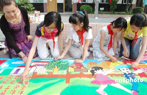 5月31日,經(jīng)過(guò)選拔來(lái)自蘇州市平江區(qū)東中市、敬文等12所實(shí)驗(yàn)學(xué)校的數(shù)十名少年兒童代表在蘇州敬文實(shí)驗(yàn)小學(xué)舉行了以愛國(guó)主義為主題的“繪百米長(zhǎng)卷”現(xiàn)場(chǎng)繪畫活動(dòng),喜迎“六一”兒童節(jié)到來(lái)。中新社發(fā) 蘇民 攝