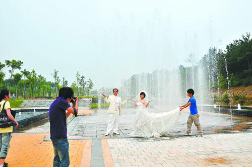 對許多人而言,墓地是忌諱之地,但21日的武漢黃陂長樂園陵園卻迎來了兩對“80后”新人,他們以陵園里的綠陰湖畔、噴泉長廊為背景,定格一個(gè)個(gè)甜蜜的瞬間。