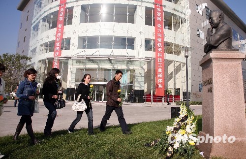11月3日下午,中國目前最具實(shí)力的空間技術(shù)及其產(chǎn)品研制基地、人造衛(wèi)星和神舟飛船的“搖籃”——中國空間技術(shù)研究院在北京航天城舉行儀式,深切緬懷該院老院長、“中國航天之父”錢學(xué)森。正在中國空間技術(shù)研究院就讀研究生的航天青年學(xué)子們面朝錢學(xué)森塑像列隊(duì)肅立默哀一分鐘,向錢老塑像敬獻(xiàn)花籃,隨后依次手持黃、白菊花敬獻(xiàn)錢老塑像并鞠躬致敬。中新社發(fā) 孫自法 攝
