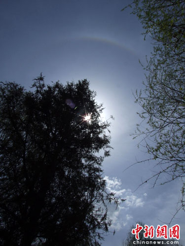 中新網(wǎng)5月23日電 (高峰毅 焦瑾琦) 近日,華北地區(qū)氣溫居高不下。5月21日晚9時(shí)許,山西五臺(tái)山出現(xiàn)了月暈現(xiàn)象,持續(xù)了近一個(gè)小時(shí)。而第二天,即22日上午9時(shí)許,五臺(tái)山上空又出現(xiàn)了日暈奇觀,,并持續(xù)了兩個(gè)多小時(shí)。這兩種暈的出現(xiàn)時(shí)間差不足12小時(shí),著實(shí)令人稱奇。