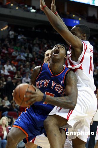當(dāng)?shù)貢r(shí)間1月10日晚,主場(chǎng)作戰(zhàn)的火箭隊(duì)以96比76大勝紐約尼克斯隊(duì)。斯科拉和姚明今天聯(lián)手內(nèi)線(xiàn)有不錯(cuò)發(fā)揮,火箭全隊(duì)多點(diǎn)開(kāi)花,第三節(jié)火箭隊(duì)打出進(jìn)攻高潮,最終擊敗尼克斯,取得三連勝。中新社發(fā) 歐文 攝