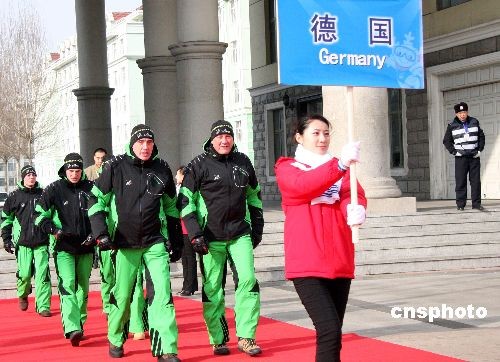 2月14日上午10時(shí),第24屆世界大學(xué)生冬季運(yùn)動(dòng)會(huì)德國體育代表團(tuán)歡迎儀式暨德國體育代表團(tuán)升旗儀式在黑龍江大學(xué)大運(yùn)村升旗廣場舉行。大運(yùn)村執(zhí)行村長張政文、村長助理張曉光以及德國代表團(tuán)團(tuán)長羅蘭·約希姆一行6人出席了此次歡迎儀式。這是大運(yùn)村首次為國外代表團(tuán)舉行的歡迎儀式。中新社發(fā) 姚庭山 攝