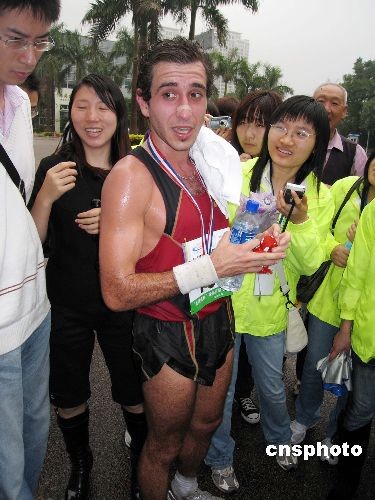 “九洲杯”珠海首屆半程馬拉松邀請(qǐng)賽于二十二日早上八點(diǎn)鳴槍起跑,該項(xiàng)賽事吸引了境內(nèi)外兩千名長(zhǎng)跑愛(ài)好者參加。經(jīng)過(guò)一番角逐,本次半程馬拉松賽的男子總冠軍由亞洲半程馬拉松紀(jì)錄保持者、香港選手史提芬奴贏得,女子總冠軍則由十六歲的中國(guó)籍女孩楊麗文奪得。圖為史提芬奴在結(jié)束比賽后接受記者的訪問(wèn)。中新社發(fā) 鄧媛雯 攝