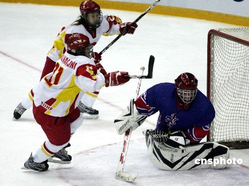 2月24日,第二十四屆世界大學生冬季運動會女子冰球小組賽最后一輪的比賽在哈爾濱冰球館結(jié)束,在晚間結(jié)束的比賽中,中國隊以8比0大勝英國。這樣中國女冰就以小組第二的身份晉級半決賽,在半決賽中她們將面對小組第三的芬蘭。圖為中國隊(白)破門得分。中新社發(fā) 富田 攝