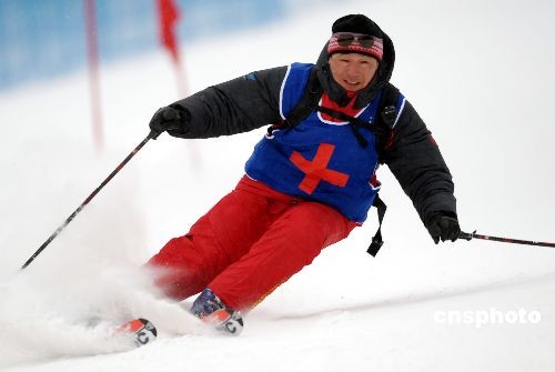 2月24日,在大冬會亞布力滑雪場高山滑雪大回轉(zhuǎn)比賽中,大冬會醫(yī)療救護隊隨時出擊。圖為醫(yī)療救護隊馳騁在雪道上。中新社發(fā) 姚庭山 攝
