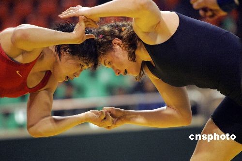 3月21日上午,由國(guó)際摔跤聯(lián)合會(huì)主辦,中國(guó)摔跤協(xié)會(huì)、太原市政府、山西省體育局承辦的“2009年女子摔跤世界杯比賽”將于今日在太原拉開(kāi)戰(zhàn)幕。在進(jìn)行的小組賽第一輪中,奧運(yùn)冠軍王嬌領(lǐng)銜的中國(guó)隊(duì)以總比分5:2戰(zhàn)勝日本隊(duì),贏得開(kāi)門(mén)紅。中新社發(fā) 張?jiān)?攝