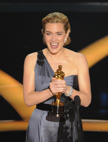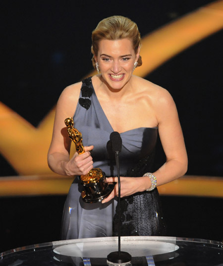 中新網(wǎng)2月23日電 美西時間2月22日下午17:00(北京時間2月23日上午9:00),第81屆奧斯卡金像獎頒獎典禮在洛杉磯柯達劇院舉行,當年在《泰坦尼克號》中飾演“露絲”一角而紅遍全球的女星凱特·溫斯萊特,今日第六次沖擊奧斯卡終于得償所愿。她憑借在《朗讀者》中的精湛演技而獲得第81屆奧斯卡最佳女主角,這位女星上臺領(lǐng)獎激動萬分,她說在八歲的時候曾經(jīng)想象這一時刻,當時的獎杯只是一個香檳杯子!拔乙兄x我的家人,所有人。我不能忘記你們。我很幸福,擁有一個愛我的丈夫和漂亮的孩子!