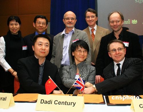 當(dāng)?shù)貢r(shí)間2月27日下午,中國商務(wù)部長陳德銘(后左二)和英國商業(yè)、企業(yè)和制度改革大臣曼德爾森(后右二)共同見證了中英企業(yè)合拍電影《楊貴妃》的簽約儀式。圖為北京春秋鴻文化投資有限公司、大地時(shí)代文化傳播(北京)有限公司與英國Capital Music公司的代表簽署1400萬美元合拍協(xié)議。中新社發(fā) 李鵬 攝