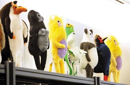 來自高雄的盧袗云與莊瑞豪,兩個(gè)年齡相仿,因?yàn)闊釔鬯囆g(shù)赴日留學(xué),回臺灣共同創(chuàng)辦“兩個(gè)八月”創(chuàng)意設(shè)計(jì)公司。一年多來,兩位大男生以一針一線縫出48只動物布偶,做成“沒有生命的動物園”,這些五顏六色布偶的表情與一般可愛布偶很不同,看起來已經(jīng)沒有生命。盧云袗說,“這些布偶主要是教育小朋友,要愛地球,否則可愛動物會面臨死亡威脅!