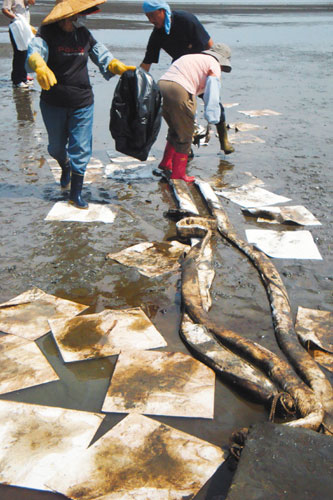 整夜沒睡協(xié)助清除油污的環(huán)保義工與義消說,昨晚海水漲潮,整個(gè)油污全冒上來,經(jīng)回流再涌到濕地岸邊。附近小區(qū)、環(huán)保義工都大嘆,“怎么會(huì)有這么沒公德心的人,好不容易復(fù)育濕地,就這樣被破壞掉!
