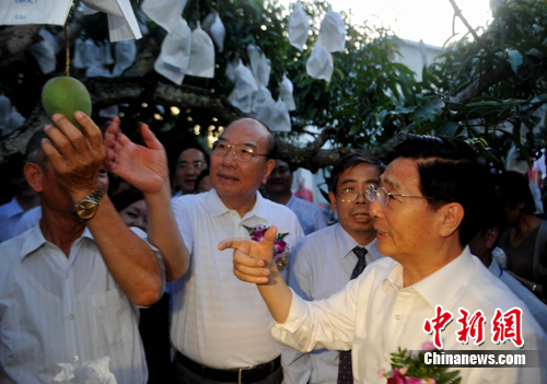 郭聲琨一行的到來受到當(dāng)?shù)孛癖姷臒崃覛g迎。果農(nóng)以一種特別的方式——燃放爆竹來歡迎遠(yuǎn)方的客人。郭聲琨抵達(dá)臺(tái)南縣南化鄉(xiāng)小侖村時(shí)已值傍晚,他深入果園,參觀豐收在望的芒果園,與果農(nóng)親切交流,了解水果產(chǎn)銷情況,并走進(jìn)集貨場(chǎng),參觀貨場(chǎng)水果分揀,包裝作業(yè)過程,品嘗臺(tái)南水果。