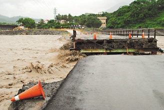 昨天上午10時(shí)許,六龜鄉(xiāng)六龜大橋旁的便橋因支撐不住暴漲荖濃溪水沖刷,中間一截應(yīng)聲斷裂,工務(wù)段緊急管制封閉;新開部落聯(lián)外的新寶橋旁便橋也同樣遭荖濃溪水沖毀,百余戶新開部落居民無(wú)法外出,臺(tái)軍士兵昨天一度冒雨搶通便道。