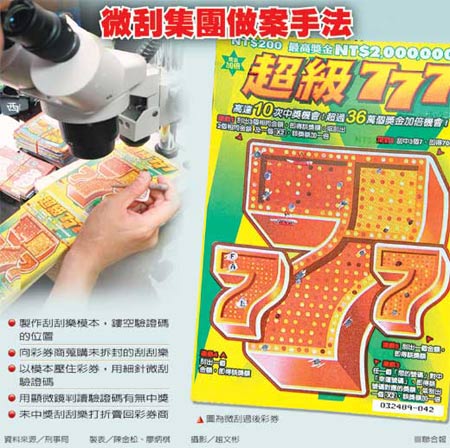中新網8月12日電 臺翁姓男子及其親友與不肖彩券經銷商掛鉤,取得大批刮刮樂彩券后,將彩券放在顯微鏡下,再使用自制細針點刮彩券刮膜,窺知是否有中獎驗證碼,留下可能中獎的彩券兌換彩金,中獎機率低的彩券再回賣經銷商,賣給不知情的民眾。警方11日逮捕翁嫌等12人,依詐欺罪嫌送辦。