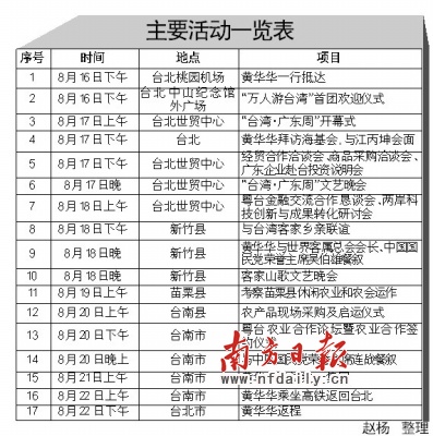 ●2010年8月16日,廣東省省長黃華華帶隊赴臺灣舉行“臺灣·廣東周”活動;顒又黝}為“合作之旅、鄉(xiāng)情之旅”,內(nèi)容包括經(jīng)貿(mào)合作、商品采購、旅游合作、農(nóng)業(yè)合作、文化交流、宣傳亞運等,當(dāng)日還將舉行“萬人游臺灣”首團啟動儀式!(記者 陶達嬪 鄧紅輝)