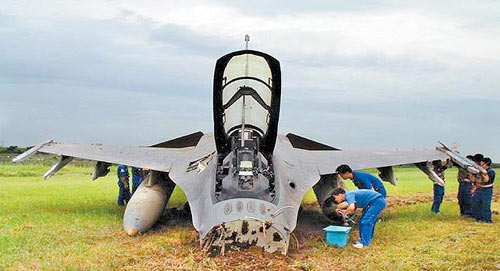 當(dāng)年6月26日機(jī)號(hào)6812的F-16B型雙座機(jī),由嘉義聯(lián)隊(duì)莊姓分隊(duì)長(zhǎng)駕駛,后座載著“國(guó)防部”整評(píng)室副主任陳姓少將,進(jìn)行戰(zhàn)術(shù)攔截課目的熟飛,降落時(shí),未注意跑道積水,致使戰(zhàn)機(jī)落地時(shí),飛行員施放阻力傘后戰(zhàn)機(jī)嚴(yán)重右偏,雖然隨即拋棄阻力傘,立即使用方向舵及煞車改正偏右狀況仍無效,戰(zhàn)機(jī)降落跑道上行進(jìn)約一公里后沖向草坪,機(jī)身嚴(yán)重受損;經(jīng)評(píng)估修復(fù)戰(zhàn)機(jī),不包括發(fā)動(dòng)機(jī)的修復(fù)即要花800多萬元新臺(tái)幣。
