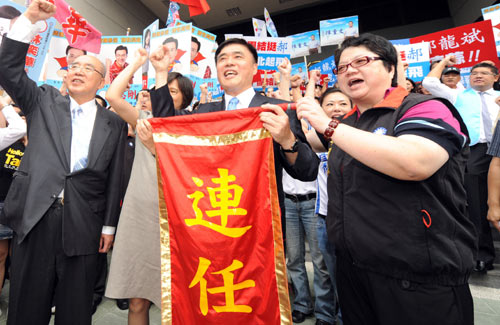 郝龍斌15日下午由高閬仙、吳伯雄及大批藍營市議員、里長參選人陪同,前往臺北市選舉委員會辦理登記。現(xiàn)場有支持者請來舞龍舞獅、有人獻上象征“包中”的包子與粽子,不少人高喊“郝龍斌凍蒜(當選)”、“連任成功”。