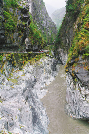 從燕子口往西,進(jìn)入太魯閣的迎賓峽,為中橫公路中最險峻的地段———錐鹿隧道。這里是馳名世界的大理石斷崖,高達(dá)1660米,下臨深淵,名曰“錐鹿大斷崖”,工程人員沿溪在崖縫中鑿出凹槽,將公路嵌鑲在巖石峭壁上,險峻無比。