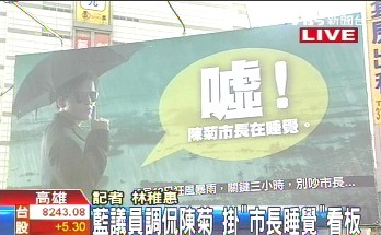 中新網(wǎng)10月1日電 據(jù)臺灣TVBS報道,高雄市長陳菊坦承在919風(fēng)災(zāi)當(dāng)天下午,人在官邸休息,風(fēng)波持續(xù)延燒,藍(lán)營議員昨天(9月30日)下午在高雄市中心,掛上調(diào)侃陳菊市長的廣告牌,內(nèi)容是一名黑衣人回頭比“噓,市長在睡覺”,極盡調(diào)侃之能事。