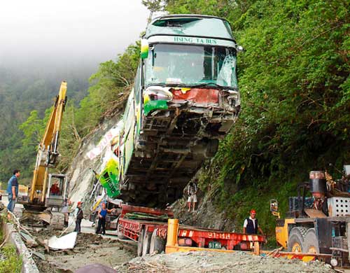 中新網(wǎng)10月26日電 據(jù)臺灣《聯(lián)合報》報道,臺灣蘇花公路112.8公里處,施工單位昨天用大型吊車把毀損的游覽車吊掛起來,再放置在板車上。