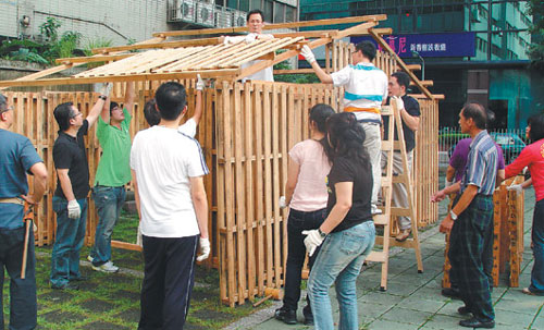 中新網(wǎng)10月27日電 據(jù)臺灣《聯(lián)合報(bào)》報(bào)道,臺灣房價(jià)居高不下,許多人被迫一生當(dāng)“房奴”。臺藝術(shù)家盧建銘、許淑真要提供平民技術(shù),示范用25分鐘蓋好6坪(1坪約是3.3平方米)木房,把建屋權(quán)從建商交還一般人,也讓房子從“私人昂貴商品”還原成“眾人共生共食處所”,這也將是臺灣第一個(gè)“現(xiàn)場演出”的建屋行動(dòng)。