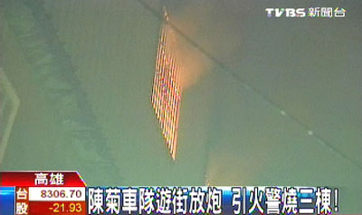 中新網(wǎng)11月24日電 據(jù)臺灣“中廣新聞”報道,民進(jìn)黨高雄市長候選人陳菊23日傍晚到高雄縣梓官鄉(xiāng)車隊掃街拜票,支持者和車隊沿途猛放鞭炮,沖天炮四處亂竄,結(jié)果,飛沖到光明路一家電子專賣店三樓,導(dǎo)致這家電子專賣店三樓失火,火勢并且迅速延燒到隔壁兩間民宅的三樓,消防局出動七輛消防車前往搶救,近一小時才將火勢完全撲滅。