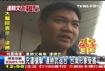 中新網(wǎng)11月27日電 據(jù)臺灣TVBS報(bào)道,在臺灣“五都”選前最后一天,國民黨榮譽(yù)主席連戰(zhàn)之子連勝文遭到槍擊。27日上午11點(diǎn)55分,連勝文的弟弟連勝武從香港飛抵臺灣。他說,知道這樣的事情,他很替哥哥心痛。