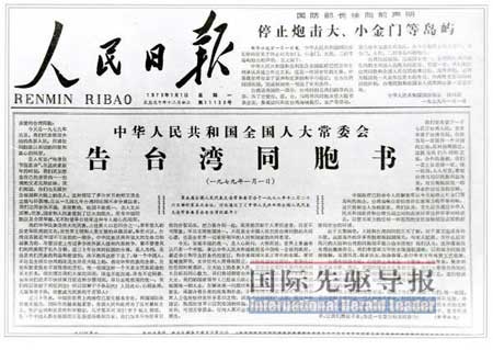 良好的國(guó)內(nèi)外氛圍催生了《告臺(tái)灣同胞書(shū)》。這是《人民日?qǐng)?bào)》頭版頭條送給兩岸同胞的新年大禮,短短1900字,融化了兩岸30年的堅(jiān)冰。
