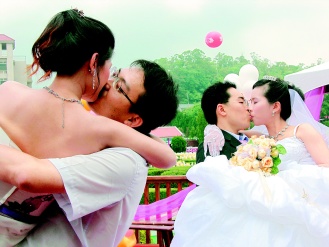 南投縣柯士文、許雅雯著古裝結(jié)婚,他的表哥簡復(fù)強與李宜芳牽手,雙喜臨門。澳洲籍Jeremy Horcock是唯一外籍新郎,因新娘彭婉萍希望婚禮特別,上網(wǎng)搜尋到苗栗這場別開生面的婚禮。