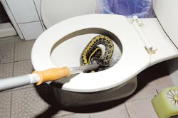 中新網(wǎng)5月11日電 一朝被蛇咬,十年怕馬桶?據(jù)臺(tái)灣《中國(guó)時(shí)報(bào)》報(bào)道,住南投埔里鎮(zhèn)山區(qū)的林姓男子,日前坐馬桶小解時(shí),突感下體一陣劇痛,回頭赫見一條巨蛇躲在馬桶里昂首吐舌信,咬破他的陰囊鮮血直流,趕緊負(fù)傷求助鄰人送醫(yī);醫(yī)生說所幸黑眉錦蛇無毒,否則連小命也不保。