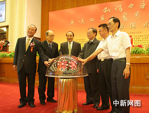 中新網(wǎng)北京6月9日電 (吉翔)為慶祝中華人民共和國成立60周年,進(jìn)一步推動海峽兩岸文化交流與合作,“和諧中華·海峽兩岸書畫藝術(shù)家交流活動”9日中午在北京人民大會堂啟動。