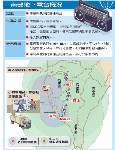吳姓業(yè)者說,地下電臺發(fā)射塔多架設在高雄縣中寮山區(qū),這里有合法電臺發(fā)射塔,可利用合法掩護非法;其次高雄電信警察距中寮山約一個多小時車程,上山路況又不好,“執(zhí)法單位久久才會跑一趟”。