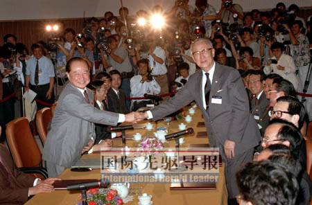 成立之初,可說是兩會(huì)協(xié)商的小陽春。海協(xié)會(huì)首任會(huì)長汪道涵和;鶗(huì)首任董事長辜振甫,不僅達(dá)成“九二共識”,還建立了兩會(huì)定期之制度化協(xié)商機(jī)制。新加坡、上海、北京,處處留下兩會(huì)協(xié)商的身影。但經(jīng)1996年臺海危機(jī)以及1999年的“兩國論”事件,兩會(huì)協(xié)商被臺灣當(dāng)局惡意中斷。2005年,辜汪二老先后辭世,留下永生的遺憾。