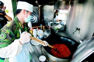 中新網(wǎng)8月4日電 據(jù)臺(tái)灣《聯(lián)合晚報(bào)》報(bào)道,臺(tái)當(dāng)局“國防部”4日上午向媒體公開臺(tái)軍自行研發(fā)的野戰(zhàn)炊事車,每輛野戰(zhàn)炊事車配備四名食勤人員,在兩小時(shí)內(nèi)可以提供300位士兵熱食。這輛炊事車每輛造價(jià)400萬元,未來配發(fā)部隊(duì)后,當(dāng)部隊(duì)野外演習(xí)時(shí),可以有機(jī)會(huì)馬上吃到熱食,而不是后面送來的冷便當(dāng)。