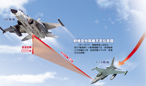 空軍臺(tái)南聯(lián)隊(duì)1架IDF戰(zhàn)機(jī)編隊(duì)飛行未依塔臺(tái)管制,在4000呎高空與嘉義聯(lián)隊(duì)1架F-16戰(zhàn)機(jī)相距僅約900呎,發(fā)生嚴(yán)重隔離不足。