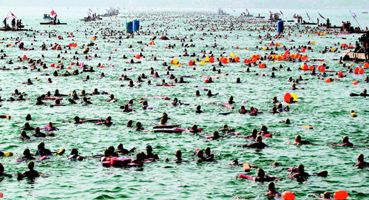 主持鳴槍下水的臺當(dāng)局“行政院長”吳敦義說,比起他二十七年前舉辦首屆泳渡的規(guī)模,足足增加五十倍。南投縣長李朝卿說,二五八八八名泳者諧音“要我發(fā)發(fā)發(fā)”,所有參加的“勇者”都發(fā)發(fā)發(fā)。