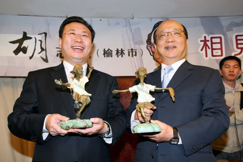 據(jù)“中央社”報(bào)道,臺(tái)中市長(zhǎng)胡志強(qiáng)今天在臺(tái)中與陜西榆林市長(zhǎng)胡志強(qiáng)相見歡,臺(tái)中市長(zhǎng)胡志強(qiáng)特別請(qǐng)雕塑家余燈銓創(chuàng)作一組“阿吉、阿祥”的“相見歡”雕像,送給榆林市長(zhǎng)胡志強(qiáng);他還開玩笑的說(shuō)“兩強(qiáng)相會(huì),強(qiáng)中自有強(qiáng)中手”。
