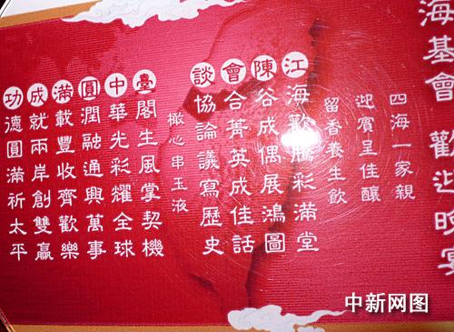 海基會為晚宴特制一份“藏頭詩”菜單:“江海歡騰彩滿堂/陳谷成偶展鴻圖/會合精英成佳話/談協(xié)論議寫歷史/臺閣生風(fēng)掌契機/中華光彩耀全球/圓潤融通興萬事/滿載豐收齊歡樂/成就兩岸創(chuàng)雙贏/功德圓滿祈太平”,以每句詩的頭一個字組成“江陳會談.臺中圓滿成功”。