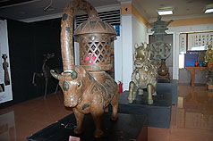 山莊內(nèi)展出的三星堆(東漢光武帝)青銅古文物,系明月居總監(jiān)黃春隆的珍藏品,以青銅器為主,包括天祿、馬車、春秋時(shí)代的編鐘、銅牛燈等數(shù)百件。