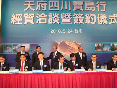 四川省工業(yè)經(jīng)濟聯(lián)合會與工業(yè)總會、臺灣區(qū)電機電子工業(yè)同業(yè)公會等川臺經(jīng)貿(mào)、旅游、農(nóng)業(yè)、文化團體,上午共簽署5份合作協(xié)議!百Q(mào)協(xié)”下午在臺北國際會議中心舉辦川臺采購洽談會,預(yù)計安排上百場1對1洽談。