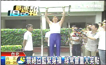 更有民進(jìn)黨中常委戲稱:“穿運動服當(dāng)然要穿運動鞋!标惷魑男ΨQ:“要穿綠色內(nèi)褲,怎么穿藍(lán)的?”蔡同榮解釋道:“我其實是請人家做,不知道他要,忘了跟他講(什么色)!