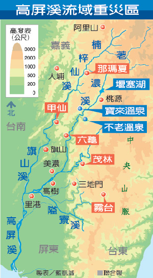 高雄縣消防局救災(zāi)中心昨天下午陸續(xù)接到報案,接近中央山脈末端的啞口與梅山口一帶下起豪大雨,造成梅山口一處堰塞湖宣泄不及而潰堤,山洪爆發(fā)后,荖濃溪洪水急漲,挾帶大量土石流向桃源鄉(xiāng)勤和村沖刷而下。