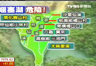 光是高屏溪上游就有8個堰塞湖潰堤,影響地區(qū)包括梅山、六龜、寶來、高樹、三地門、小林村等,至于南化關山村和臺東的太麻里溪則是拉警報。