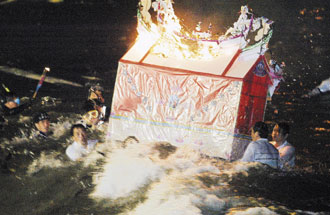 游行過后,各姓氏宗親會將水燈頭運(yùn)到望海巷海岸流放入海,象征引領(lǐng)海上亡魂回陽間接受供奉。相傳水燈頭越遠(yuǎn),宗親會來年的運(yùn)勢會越旺,各宗親紛紛默禱,希望自家水燈頭能漂向遠(yuǎn)方。