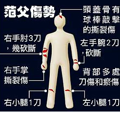 范姓少年一開燈、林就持鋁棒重擊熟睡中的范父頭部,連續(xù)敲打四、五下;范見父親抱頭抵擋,即持西瓜刀朝他身上一陣猛砍,因用力過猛,連刀柄都砍斷了,直到父親不支倒地才罷手。