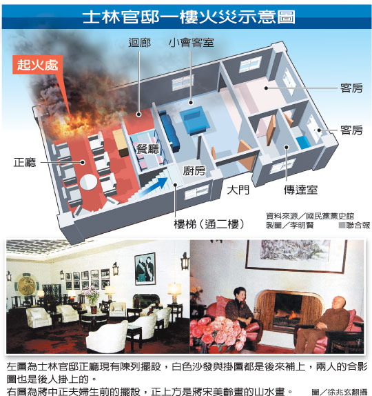 士林官邸包括開放的花園及蔣介石及夫人宋美齡的正房住所,正房是兩層樓水泥建筑,一樓是大會(huì)客室,二樓是蔣、宋起居處。前夜起火點(diǎn)在一樓右側(cè)的回廊,火苗冒出時(shí)觸動(dòng)保全警報(bào)系統(tǒng)。