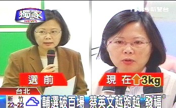 選舉結束后,大家發(fā)現(xiàn)民進黨不少人似乎都圓了一圈,甚至包括蔡英文,被指稱從電視看起來臉圓了不少。因此,民進黨中除了桃園縣長候選人鄭文燦被封為“胖周瑜”,也有人形容蔡英文是“胖貂蟬”。